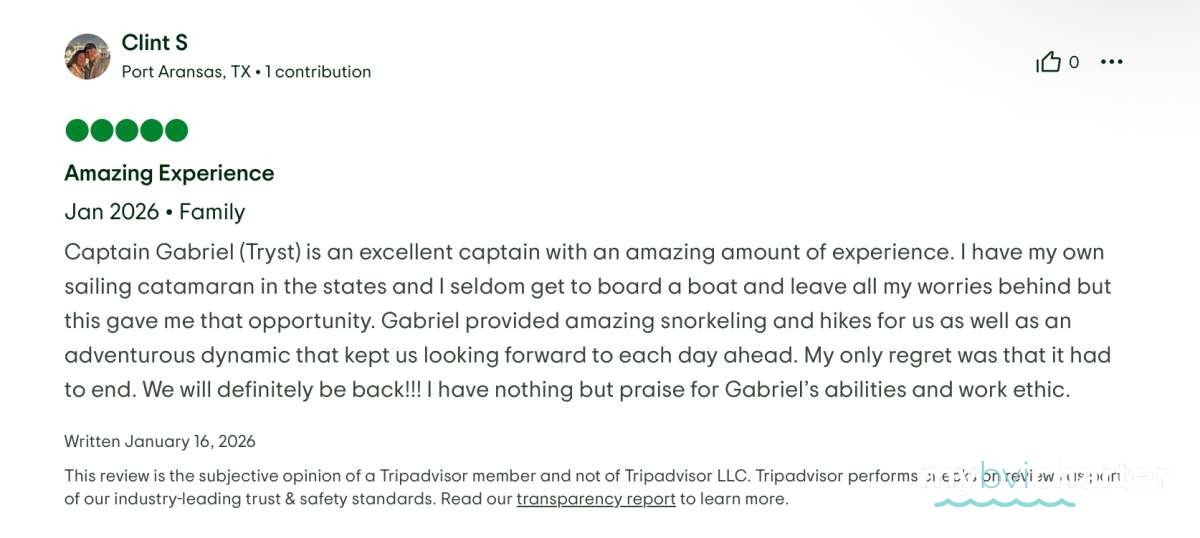 Captain Gabriel (Tryst) is an excellent captain with an amazing amount of experience. I have my own sailing catamaran in the states and I seldom get to board a boat and leave all my worries behind but this gave me that opportunity. Gabriel provided amazing snorkeling and hikes for us as well as an adventurous dynamic that kept us looking forward to each day ahead. My only regret was that it had to end. We will definitely be back!!! I have nothing but praise for Gabriel’s abilities and work ethic.