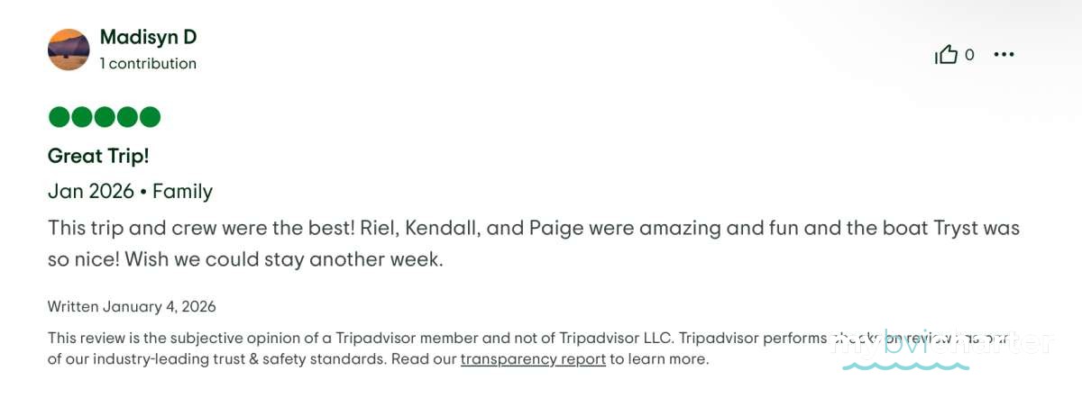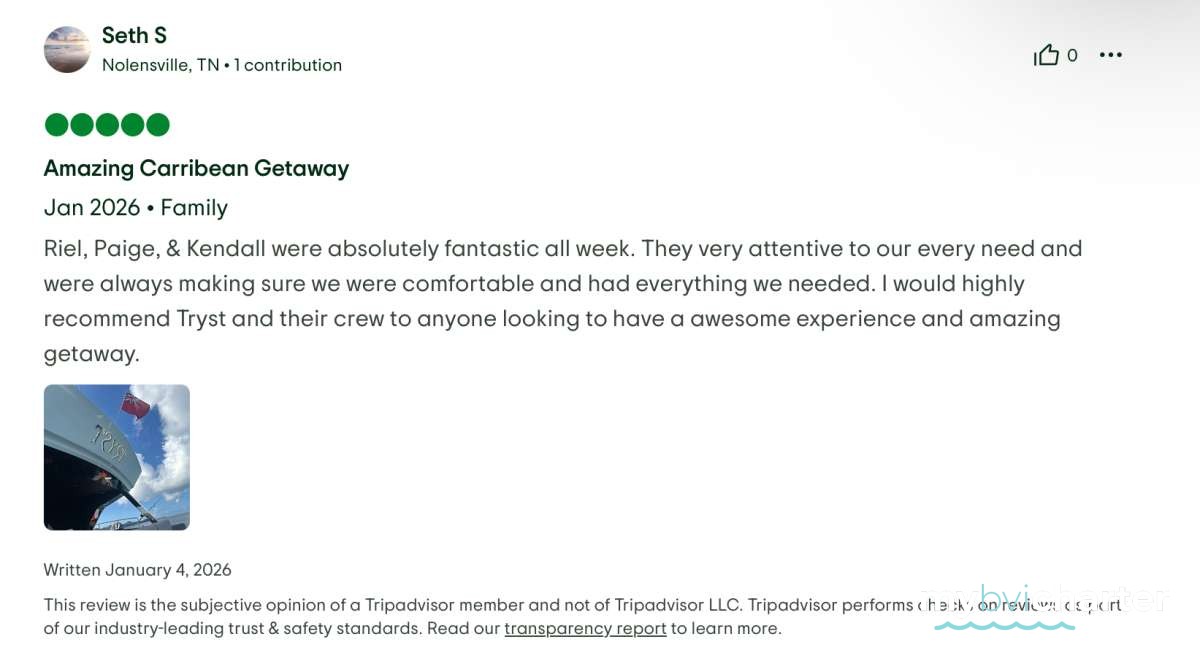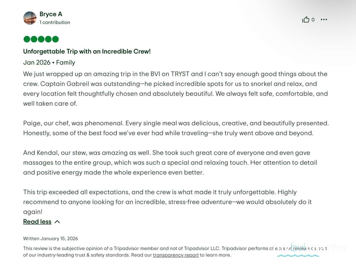 My wife and I, along with four other couples, just finished a seven-day catamaran trip in the BVI, on Tryst, and it was incredible. The food was fresh, creative, and far better than we expected for a boat — truly excellent. The service was outstanding, and the crew (Riel, Kendal and Pagie) went above and beyond the entire week. Every stop was beautiful, relaxing, and memorable.