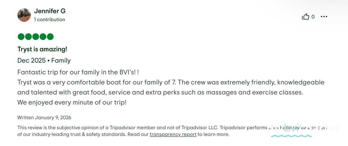 We loved our 7 day cruise thru the BVI upon the TRYST !!! The captain Rain and the crew were fabulous. The food , destination water toys made the day go by too fast. Until we meet again.