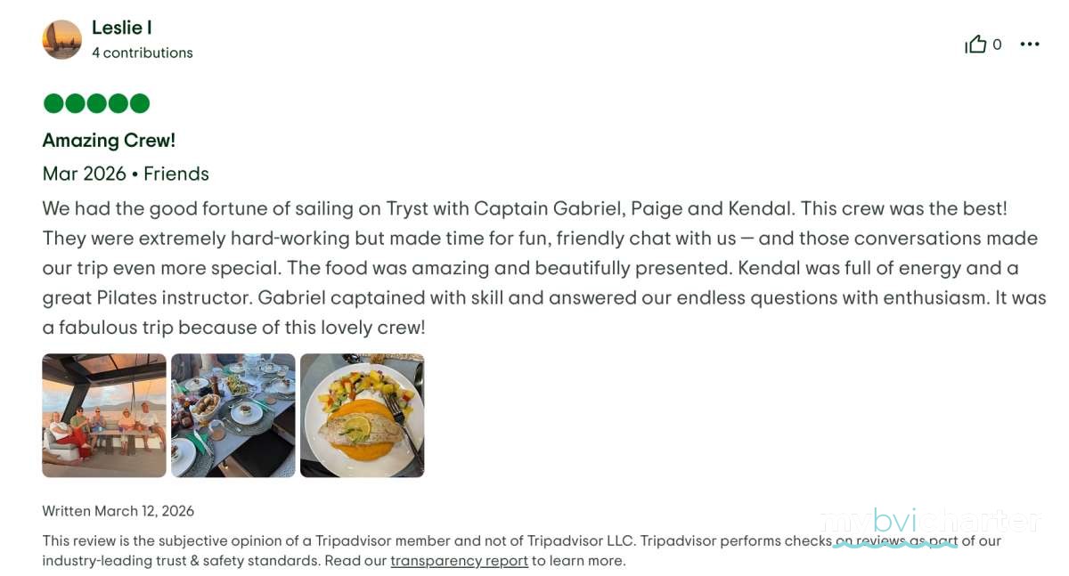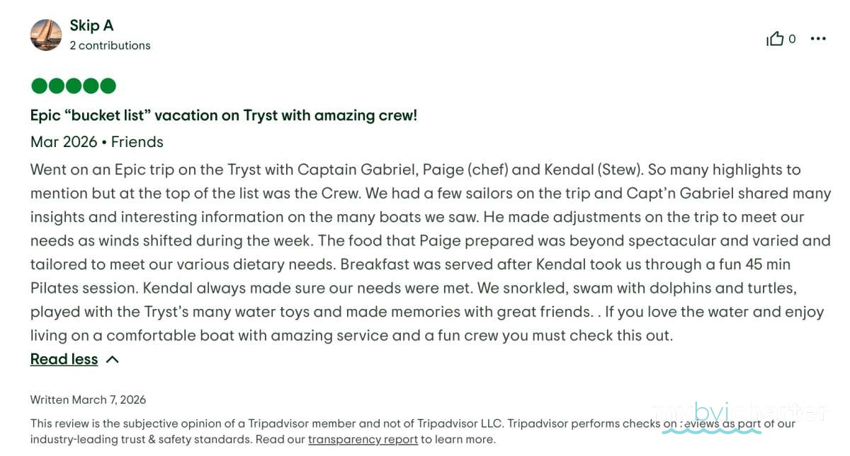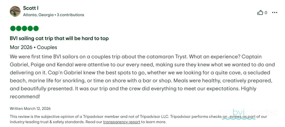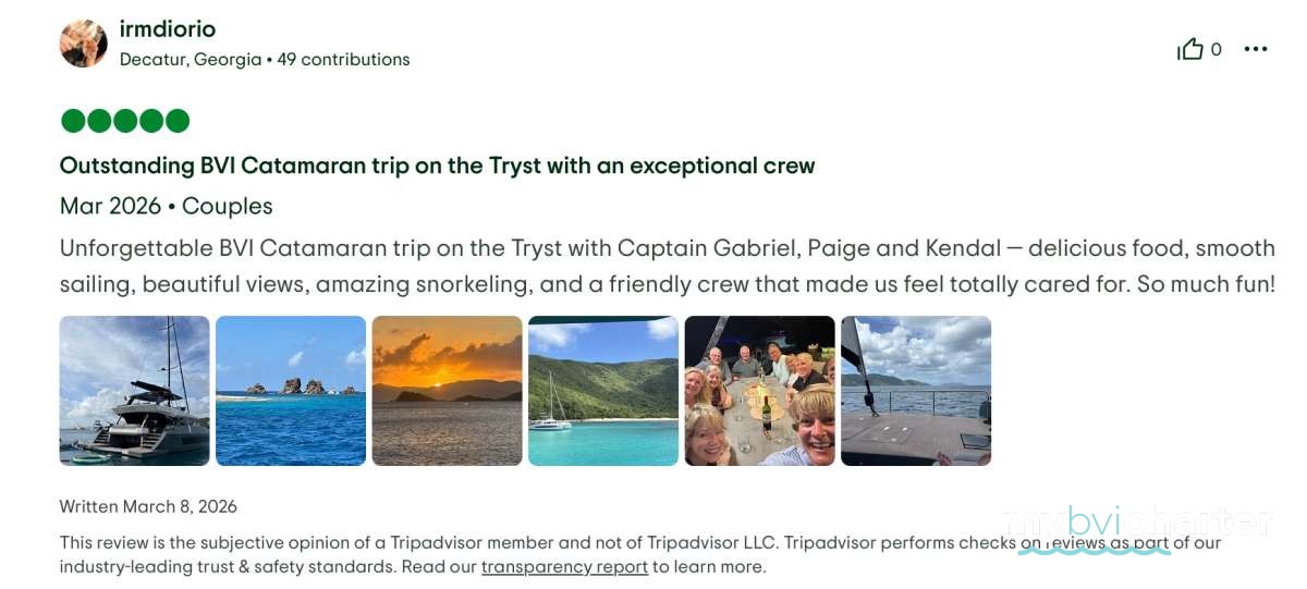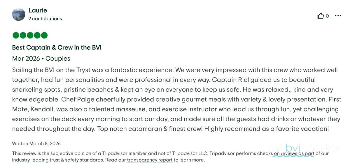 "Tryst". Captain Gabriel, Chef Paige, and First Mate Kendall were fantastic! Sailing to Anegada for lobster, great beaches, snorkeling, boat water toys, and The Bath's all made it a great time. Gabriel provided a great itinerary, Paige prepared unbelievably great meals, and Kendall made great cocktails, led fun morning exercise classes on the bow, and provided relaxing massages. The catamaran was very nice with plenty of room for a group of 8-10 guests. All in all it was a great vacation. Highly recommend the Tryst and the crew.