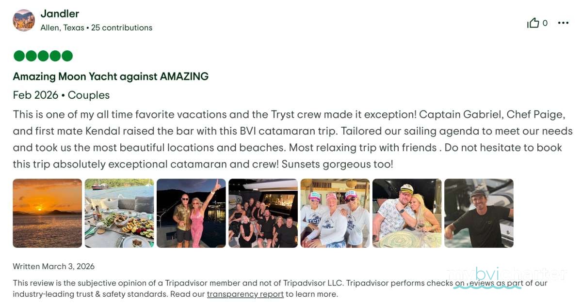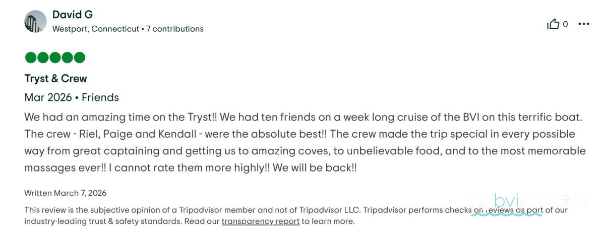 The professionalism, hospitality, and attention to detail from this crew elevated the entire journey. If you're considering a charter in the BVI, Tryst and this crew set the gold standard.