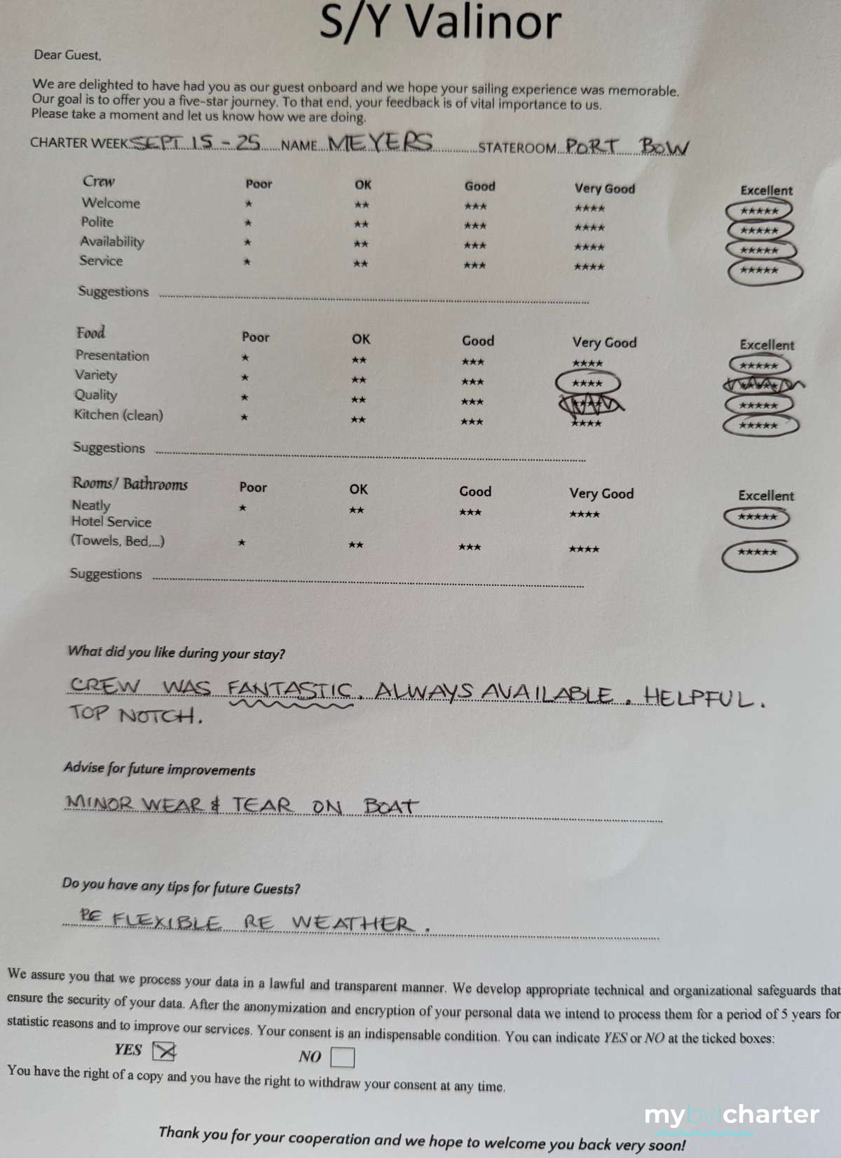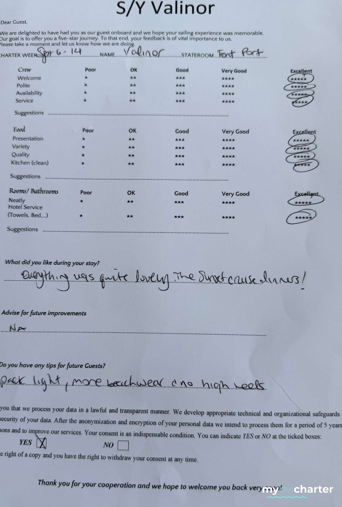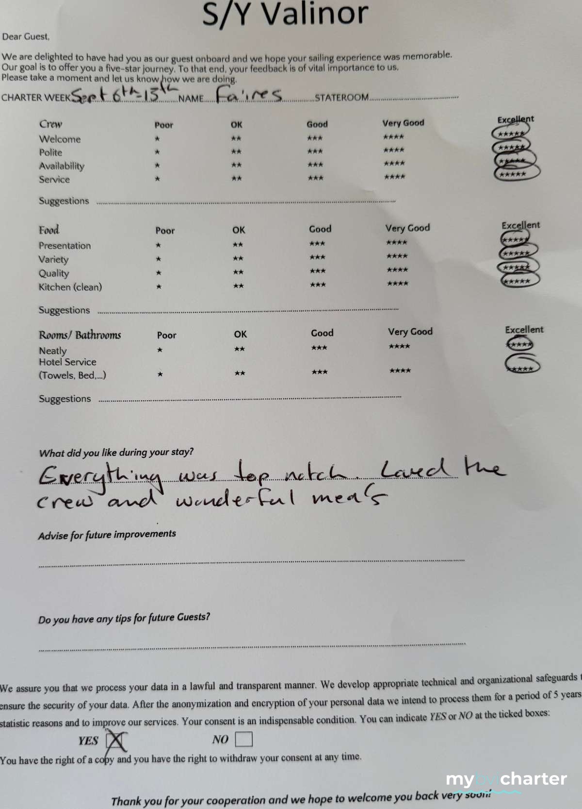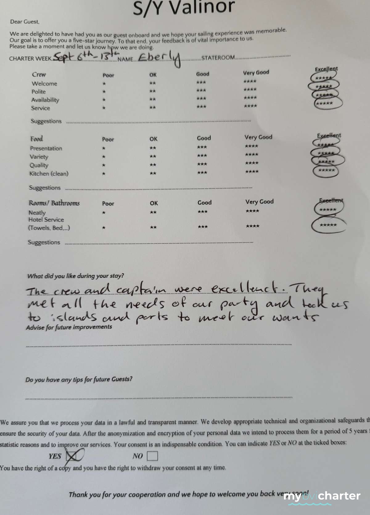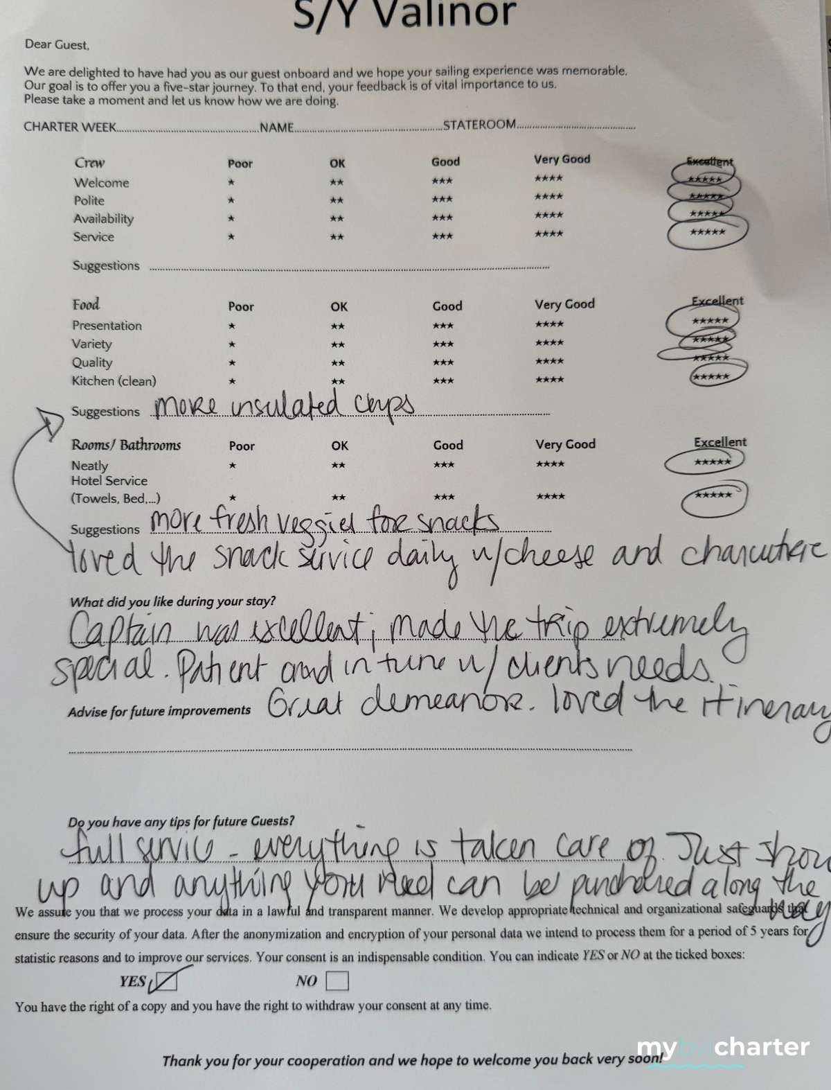Fluent in five languages, they cater to an international clientele with ease, ensuring that communication is seamless and guests feel at home. Their expertise and hospitality are the cornerstone of the Valinor experience. While Valinor operates with just two crew members, we assure you that our service level matches that of a three-member crew. This setup is our personal preference to ensure a more intimate and less crowded environment for our guests with a 5-star service that exceeds expectations!