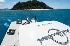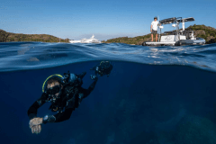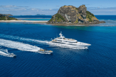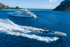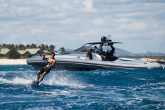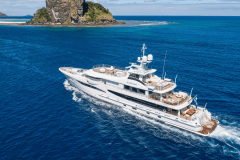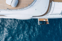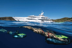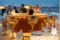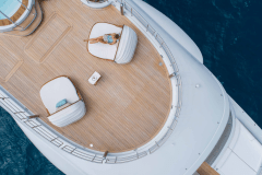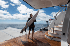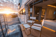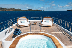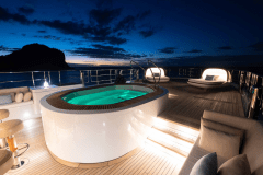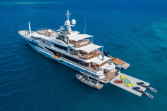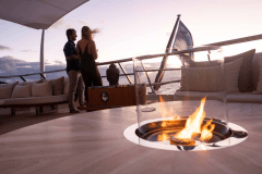 Jacuzzi up top, fire pits one deck down, cinema on the foredeck screen: DRIFTWOOD is basically a floating adult playground with its own gym and dive shop.