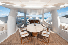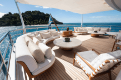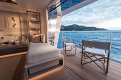The real hook is how much “outside” this yacht gives you. A large sundeck Jacuzzi, double sunpads with shade, proper bridge-deck fire pits for late nights, and an alfresco cinema using the forward mast and screen. Add a beach-club-style stern packed with water toys and scuba gear, and you get serious playtime without ever seeing a marina.
