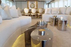 Inside, the styling leans Ralph Lauren meets Venetian dining room: monochrome sundeck, polished main salon, proper cinema in the skylounge with an 85” screen, plus a convertible outdoor movie setup when you want a film under the stars. Wi‑Fi, stabilizers underway and full AC keep the experience firmly in “civilization” even when you’re anchored in the middle of nowhere.