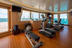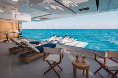 Onboard, the wellness and downtime package is fully loaded: dedicated massage/beauty rooms, sauna, gym, pool, cinema, library, beach club and a big deck Jacuzzi. Off the back, a dive center, full toy stack (Waverunners, Seabobs, boards, inflatables, floating pool, fishing and snorkel kit) and a serious swim platform mean you can treat the ocean like your personal sandbox.