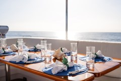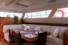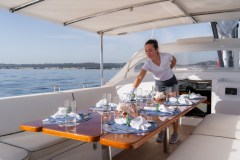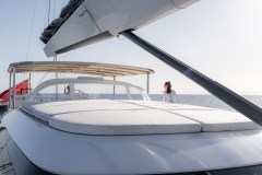 Below deck, the layout is designed for adult groups, not compromise: two equal-sized master-style cabins (master + VIP), plus a double and a twin, all with ensuites, sleeping 8 guests without the usual “someone-drew-the-short-straw” cabin. Air conditioning and Wi‑Fi are standard, not bragging rights.