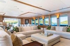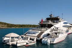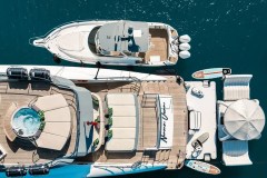 Toys and a real chase boat. Expect a serious water lineup: 2 x Sea-Doo Sparks Trixx jet skis, 2 x F5 Seabobs, a Fliteboard, wakeboards, paddleboards, and an Aquabana setup with party bana and loungers. The 37’ Sunseeker towed tender adds range for exploring, with Starlink and a cabin with shower and toilet.