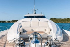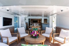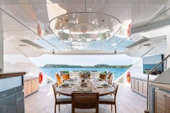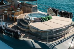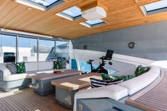 Outdoor living wins. Two-level deck setup with a jacuzzi on the bridge deck, sun pads, and dining under the hard roof, plus more lounging aft. Steps drop straight to the swim platform for quick water access. No ceremony.