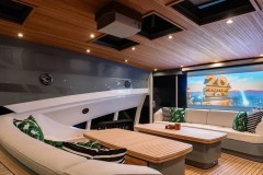 Balconies and big screens. Fold-out terraces off the main salon give you private “over the water” perches, and the sundeck 100-inch projector turns downtime into proper movie nights. Roku TV, Sonos, and Starlink keep streaming and work calls (if you insist) running smoothly.
