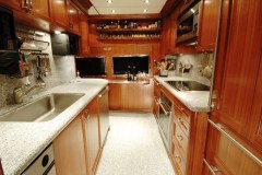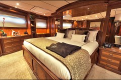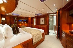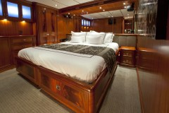 Built 2008 and refitted 2014–2015, VEGA sleeps 8 guests in 4 cabins, all with serious comfort: a full‑beam main‑deck master with his‑and‑hers bathrooms (including a steam shower spa pool), plus two convertible king cabins and a twin. Flexible layouts make her work for couples, families, or a mixed group of adults and kids.